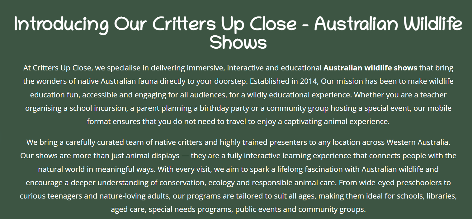 - What areas do you service across Western Australia?We are based in Perth but travel all over WA to deliver our Australian wildlife shows, including regional towns, remote communities, environmental centres, festivals, libraries and more. If you are unsure whether we can reach your location, just get in touch and we will do our best to accommodate.
