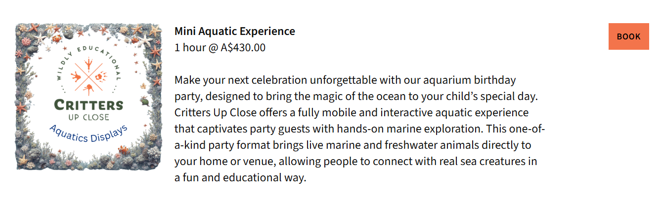 - Do you supply tables or tanks?Yes. We bring all required display equipment, including tanks, marine life, water, signage and even shade if needed.