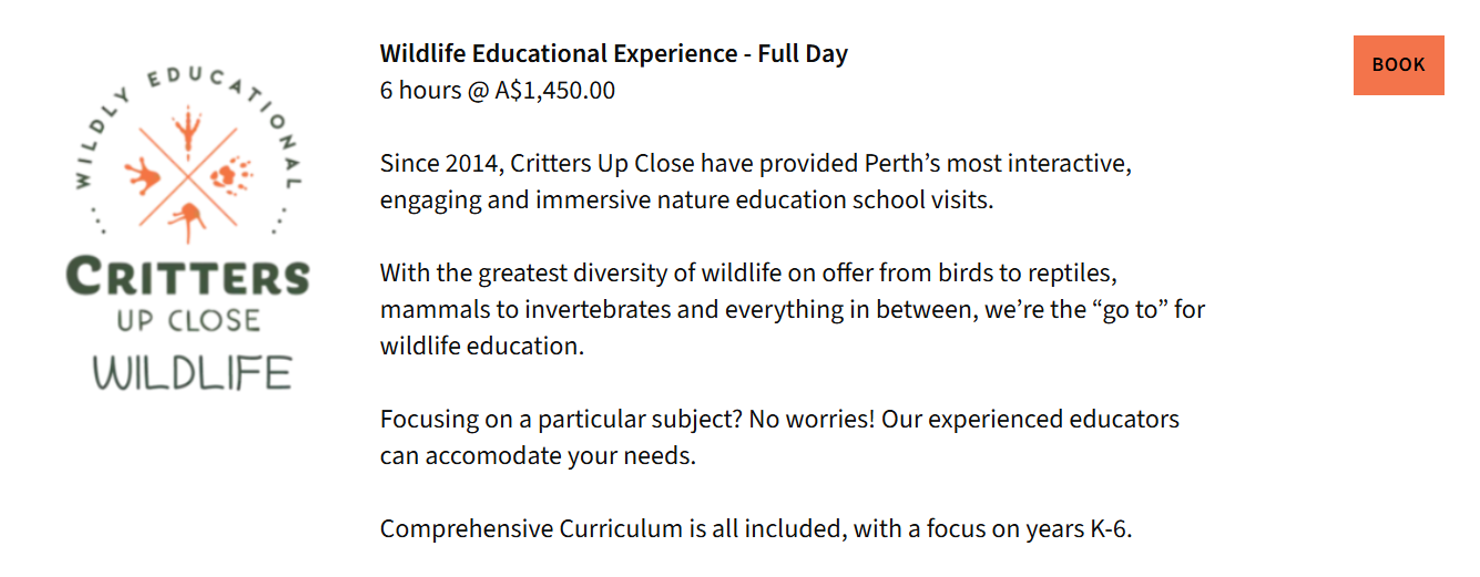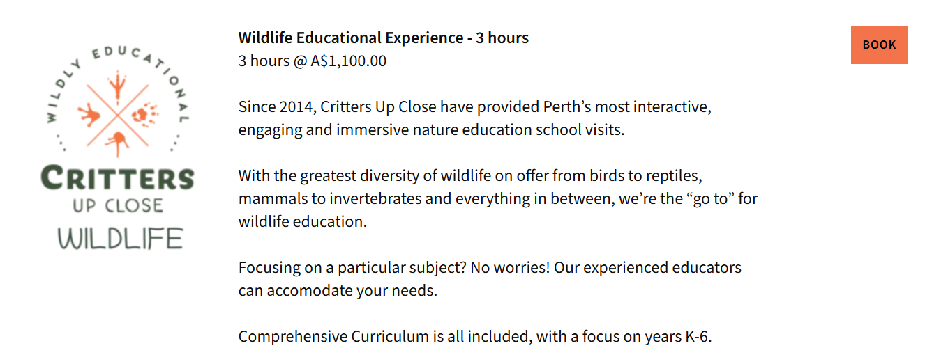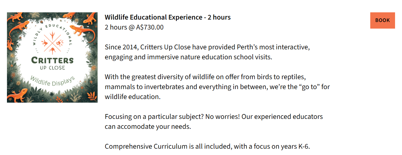 - Are your programs linked to the curriculum?Yes. All animal presentations for schools are mapped to the Australian Curriculum and include free printable teacher resources.